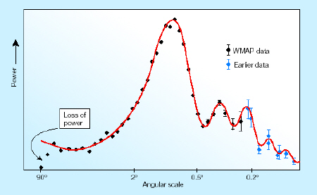 Data from the first year of the WMAP satellite – unveiled in February - agreed with the predictions of the standard big bang plus inflation model of cosmology for regions of space separated by small angles. However, on larger angular scales – greater than 60° - the WMAP observations were significantly lower than this model predicted (figure 1).
